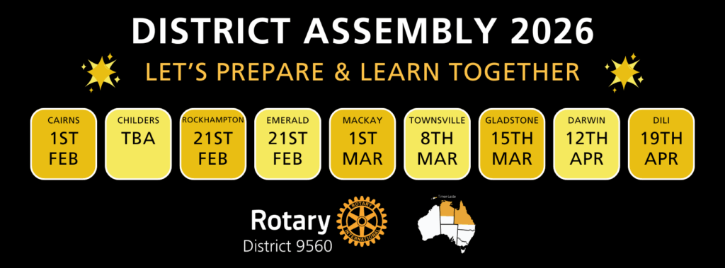 Rotary District 9560 Northern Australia and Timor-Leste compasses Maryborough in the South to Bamaga in the North and Darwin in the West, covering some 2.1 million square kilometres.